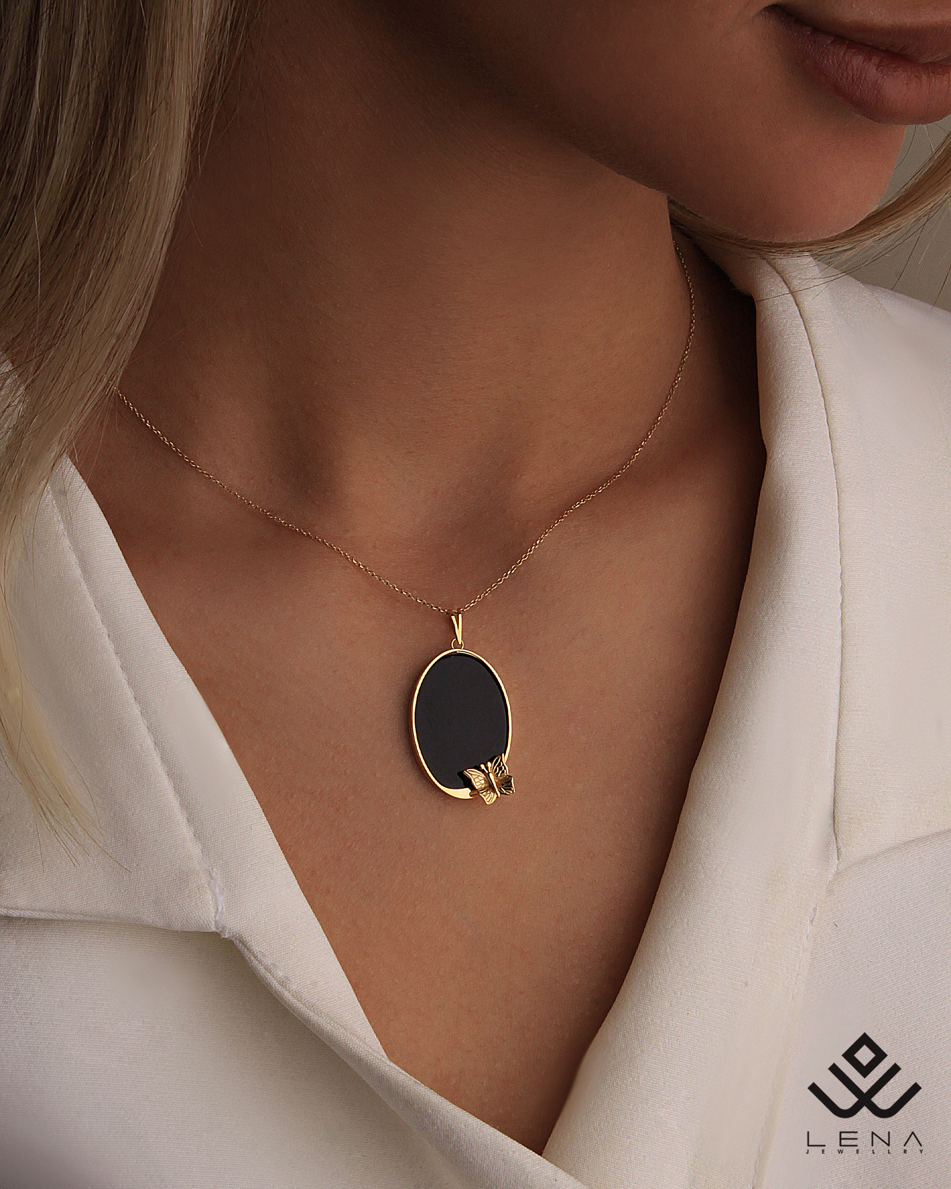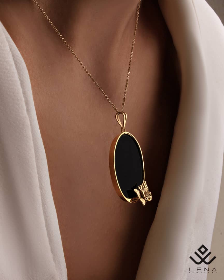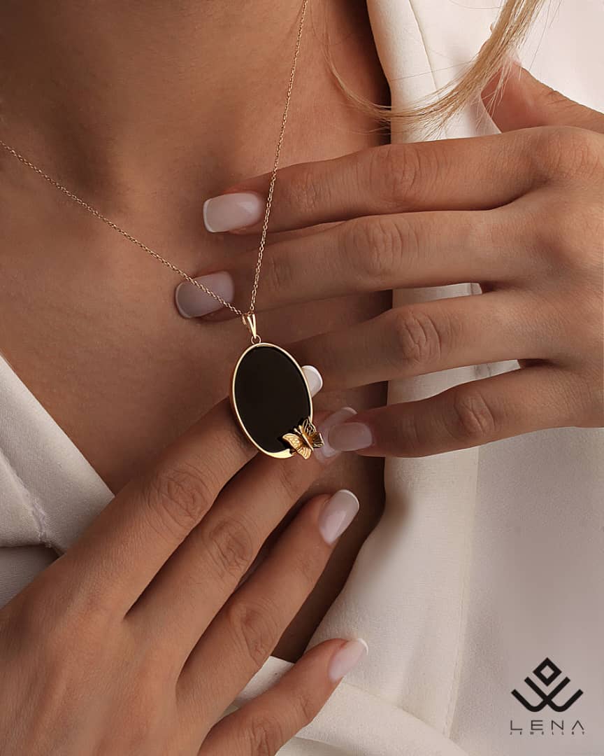 آویز طلا بیضی مشکی با پروانه ساختهشده از طلا ۱۸ عیار با طراحی ویژه از لنا گالری.