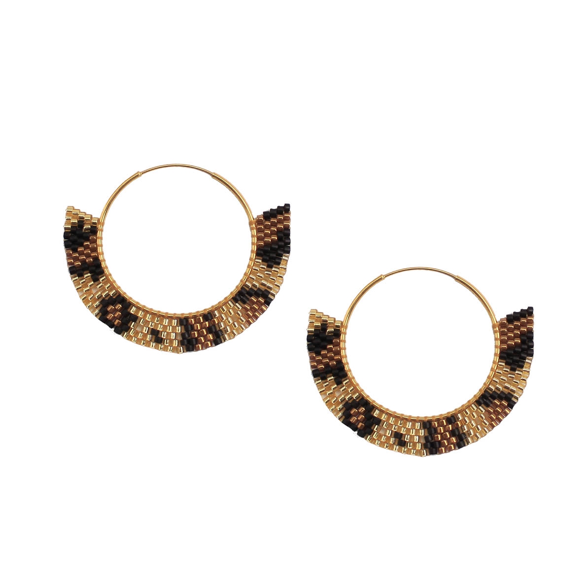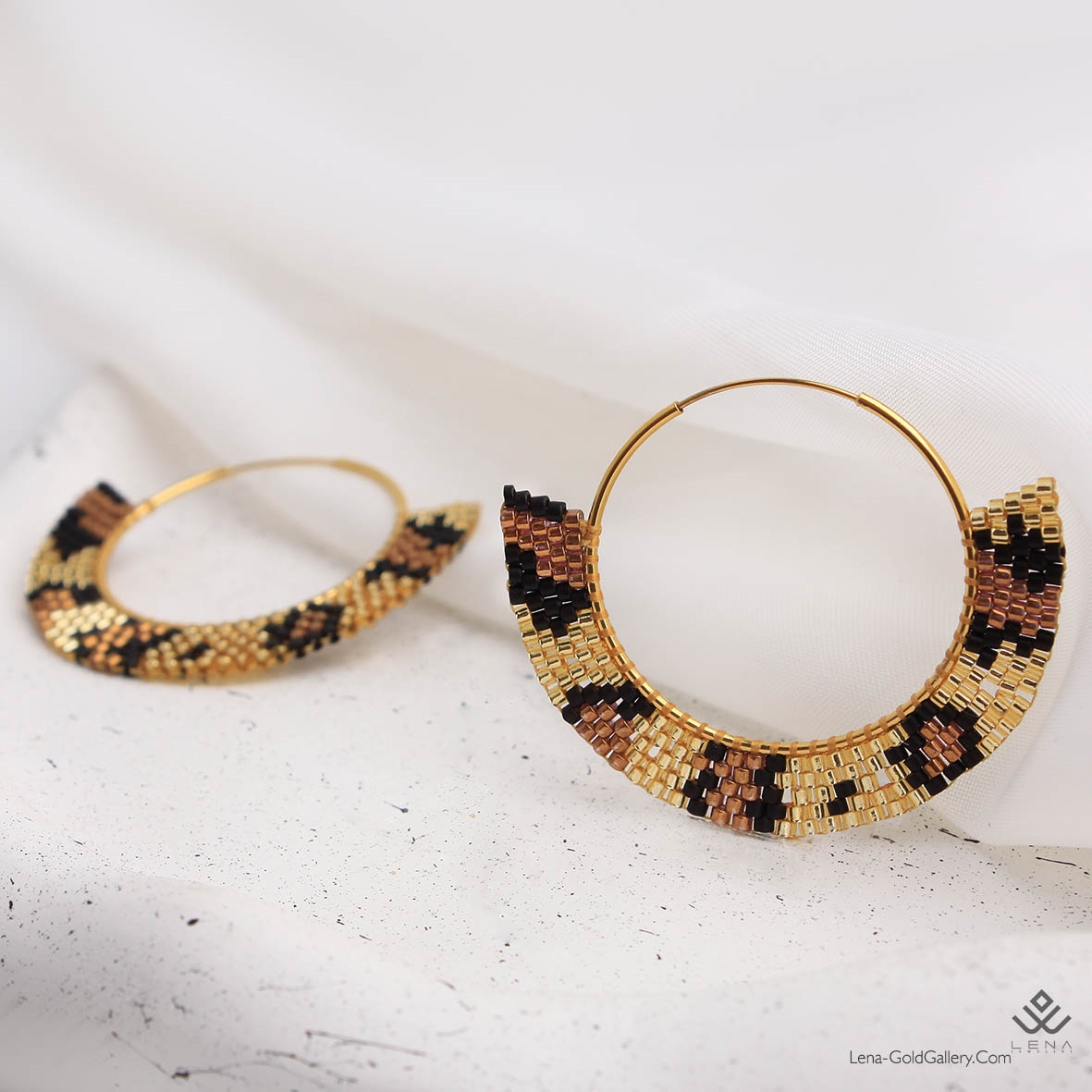 گوشواره طلا میوکی پلنگی ترکیبی منحصربهفرد از هنر دست، اصالت طلا و جسارت مدرن است. این گوشوارهها با مهرههای میوکی ژاپنی با کیفیت بالا ساخته شدهاند که در کنار طلا، طرحی شبیه پوست پلنگ را خلق کردهاند. ترکیب رنگهای طلایی، قهوهای و مشکی جلوهای چشمگیر و لوکس به این اثر بخشیده است.