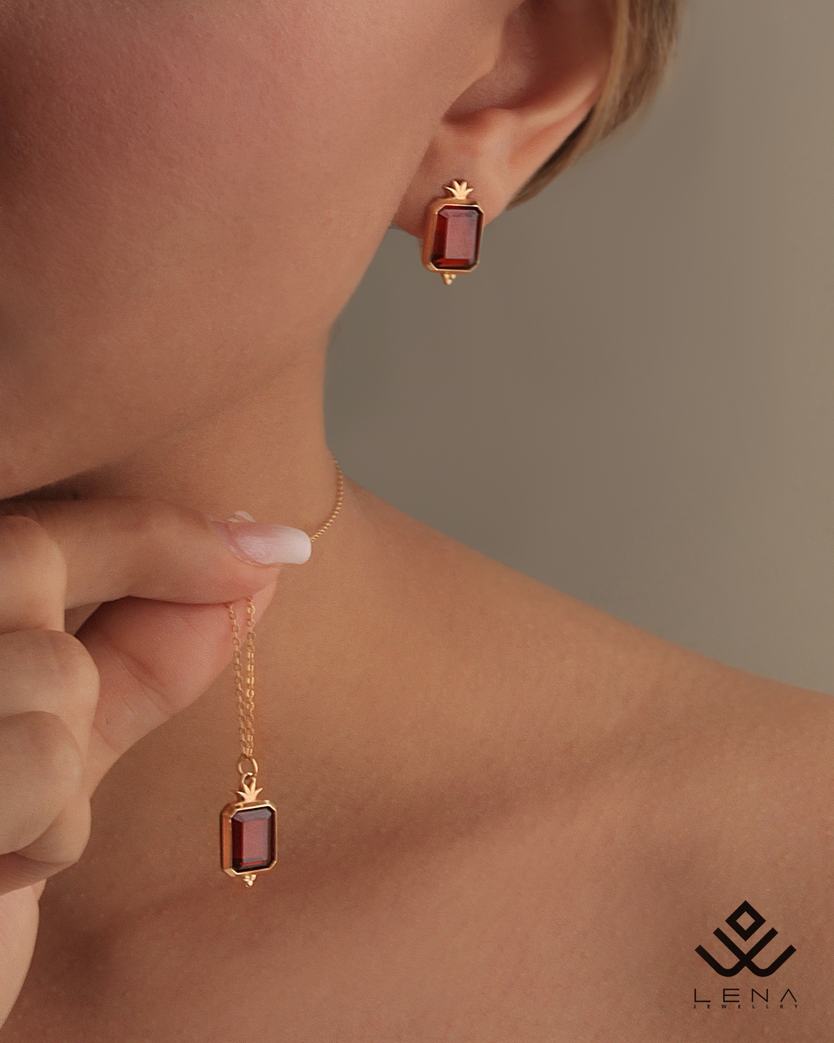 گوشواره طلا میخی انار با سنگ مستطیلی قرمز